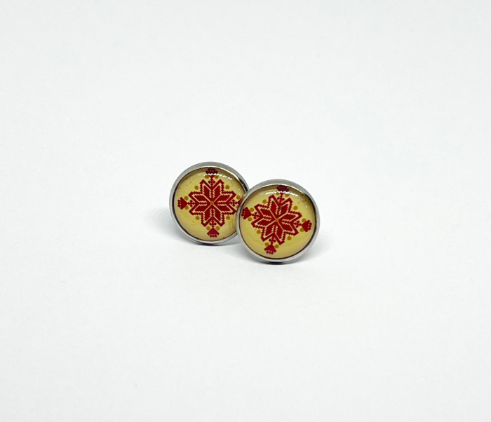 Cercei rotunzi cu model tradițional floral în nuanțe de roșu intens pe fundal bej cald. Realizați din rășină pe bază din oțel inoxidabil, acești cercei aduc un omagiu frumuseții broderiilor românești și simbolizează vitalitatea și feminitatea.