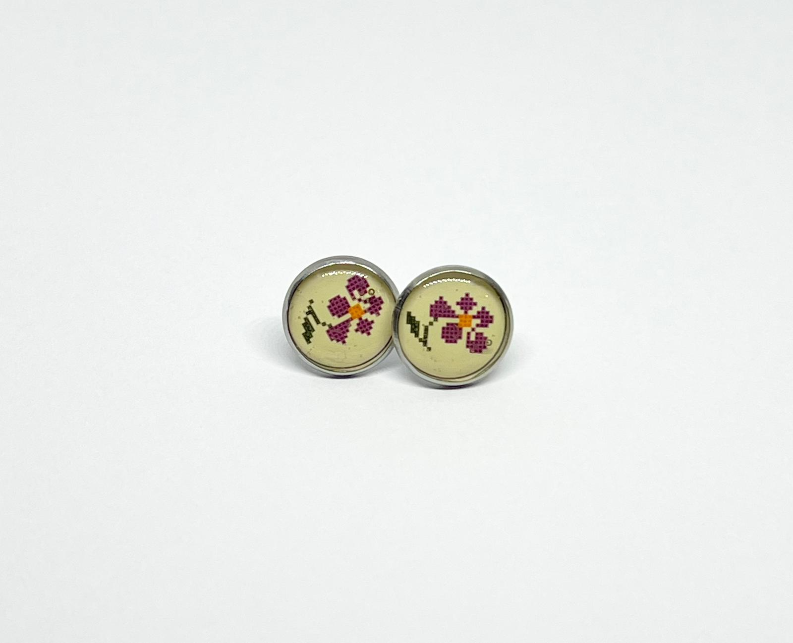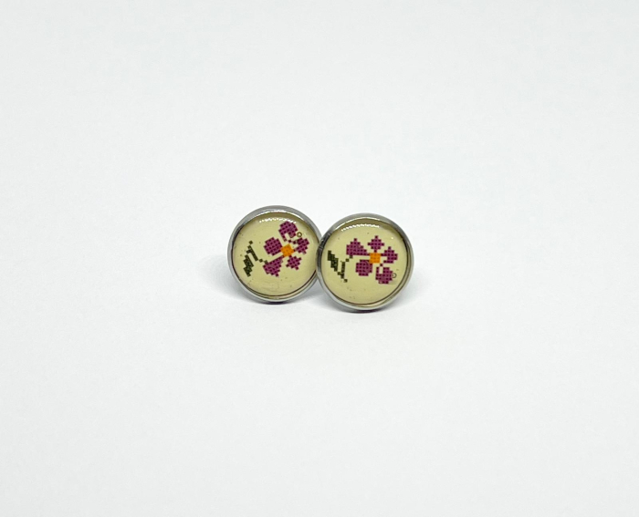 Cercei rotunzi cu model floral tradițional în nuanțe de mov și roz, ce evocă feminitatea și delicatețea portului popular. Realizați din rășină pe bază din oțel inoxidabil, potriviți pentru o notă discretă de culoare și tradiție.