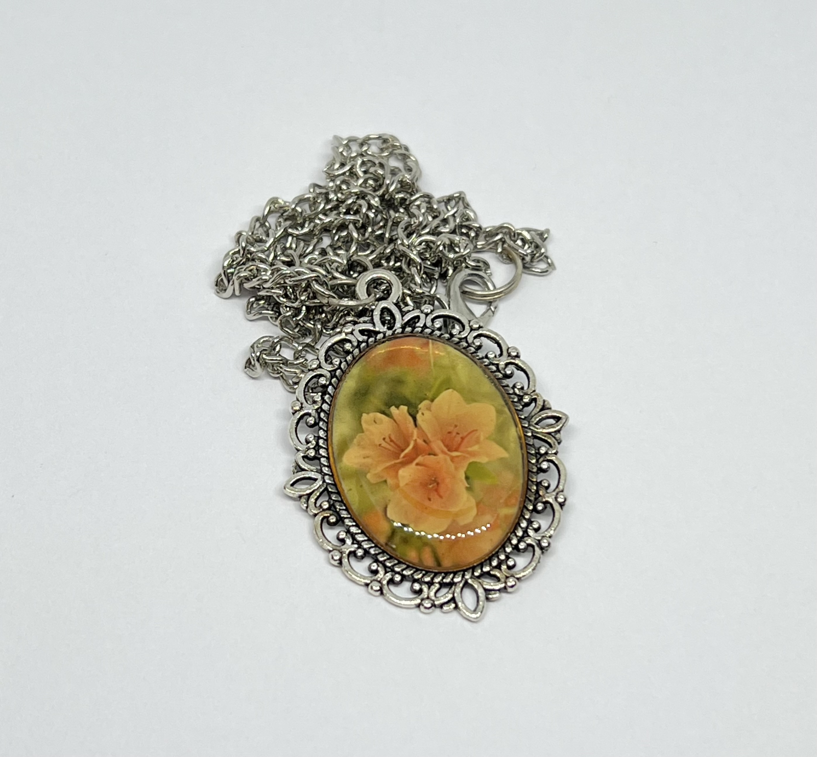 Un colier romantic și luminos, cu pandantiv oval decorat cu flori delicate de cais în nuanțe calde de portocaliu și galben. Printul este sigilat manual cu rășină lucioasă, care evidențiază culorile pastelate. Baza filigranată oferă un aspect vintage și rafinat.