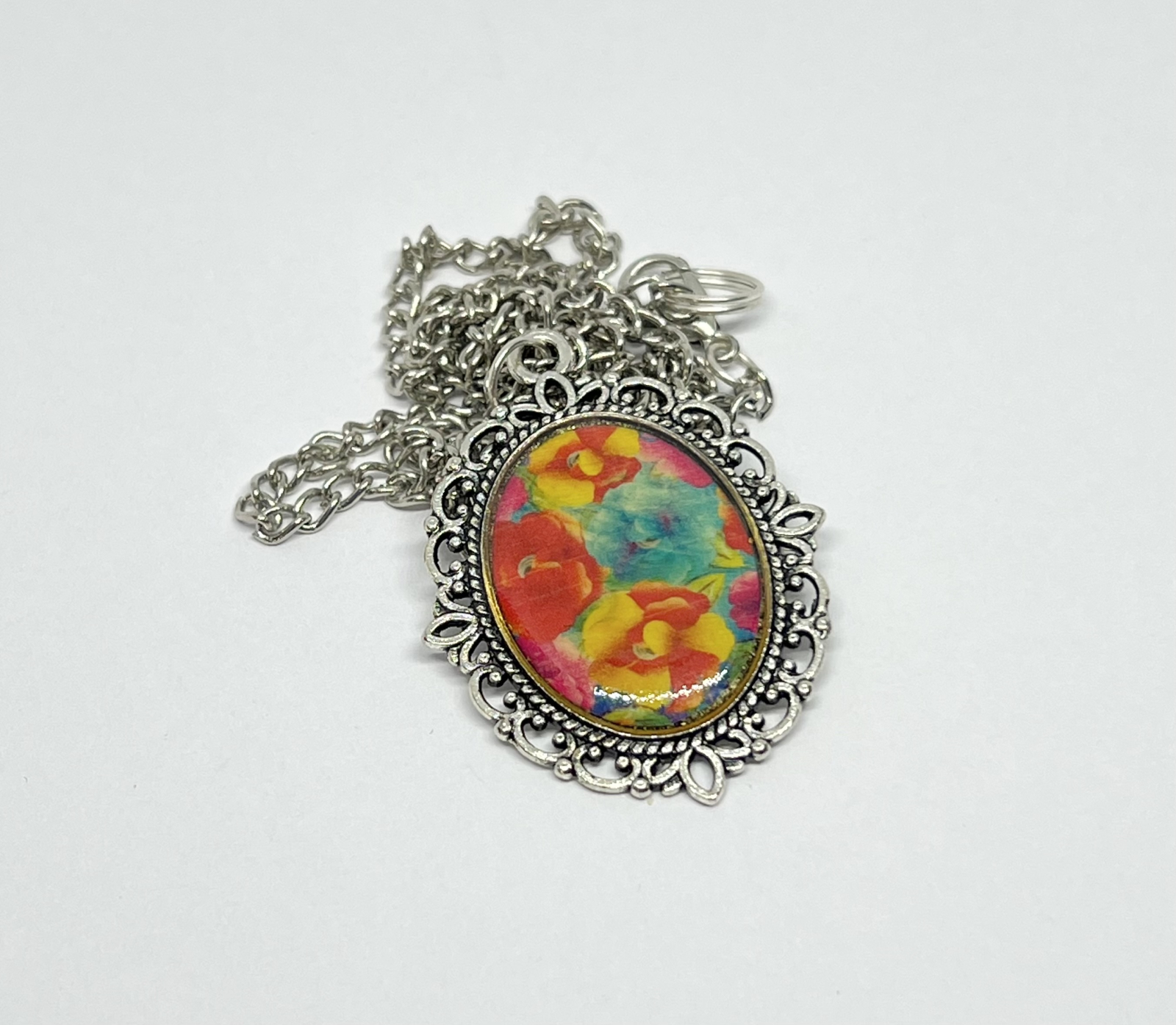 Un colier plin de viață, realizat manual, cu pandantiv oval decorat cu flori în nuanțe vii de galben, roșu și turcoaz. Printul este protejat de un strat de rășină transparentă care amplifică culorile și conferă un efect lucios spectaculos. Un accesoriu vesel și expresiv, perfect pentru iubitoarele de culoare și originalitate.