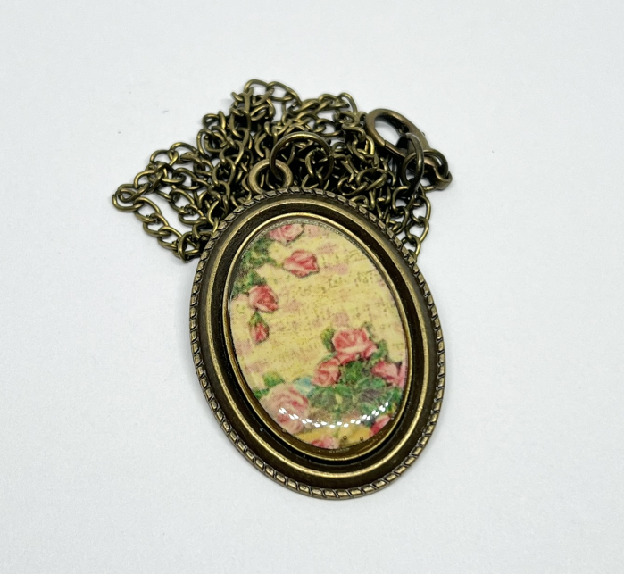 Colier romantic cu pandantiv oval, decorat cu un model floral în tonuri pastel de roz și verde pe fundal texturat bej. Printul este acoperit manual cu rășină lucioasă, care oferă rezistență și un efect de sticlă. Rama bronz antic completează perfect aspectul vintage al piesei.