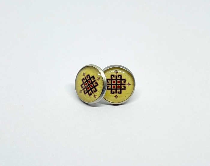 Cercei cu model tradițional geometric, simbolizând infinitul și legătura dintre trecut și prezent. Tonurile de mov și roșu se completează perfect, iar stratul de rășină lucioasă oferă un aspect rafinat și rezistent.