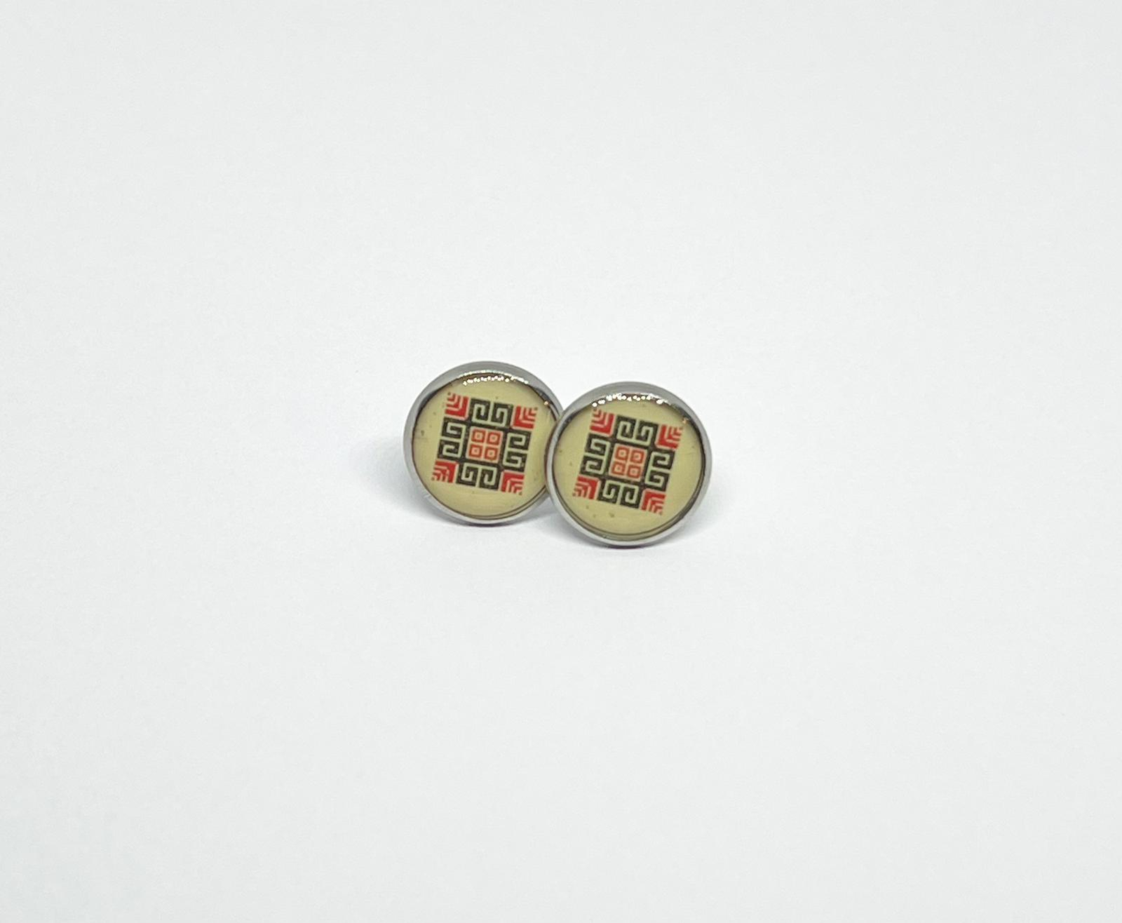 Cercei cu model tradițional geometric în nuanțe de roșu și negru, inspirat din cusăturile vechilor ii românești. Lucrați manual cu atenție la detalii, pe bază din oțel inoxidabil, acoperiți cu un strat lucios de rășină rezistentă.