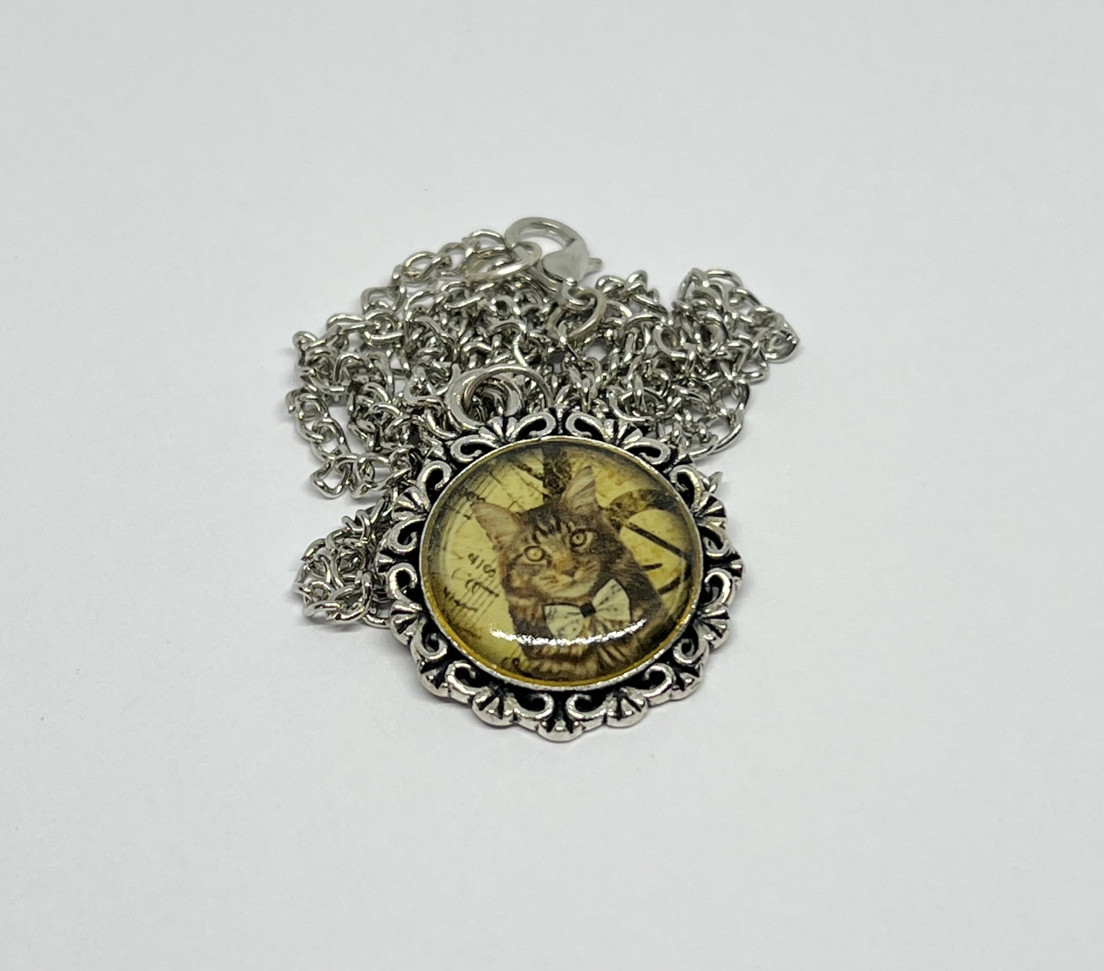 Colier handmade cu pandantiv rotund, decorat cu o imagine vintage reprezentând o pisică elegantă, perfectă pentru iubitorii de feline și detalii inedite. Printul este protejat cu rășină transparentă, oferindu-i luciu și profunzime, iar rama metalică argintie adaugă un farmec retro.