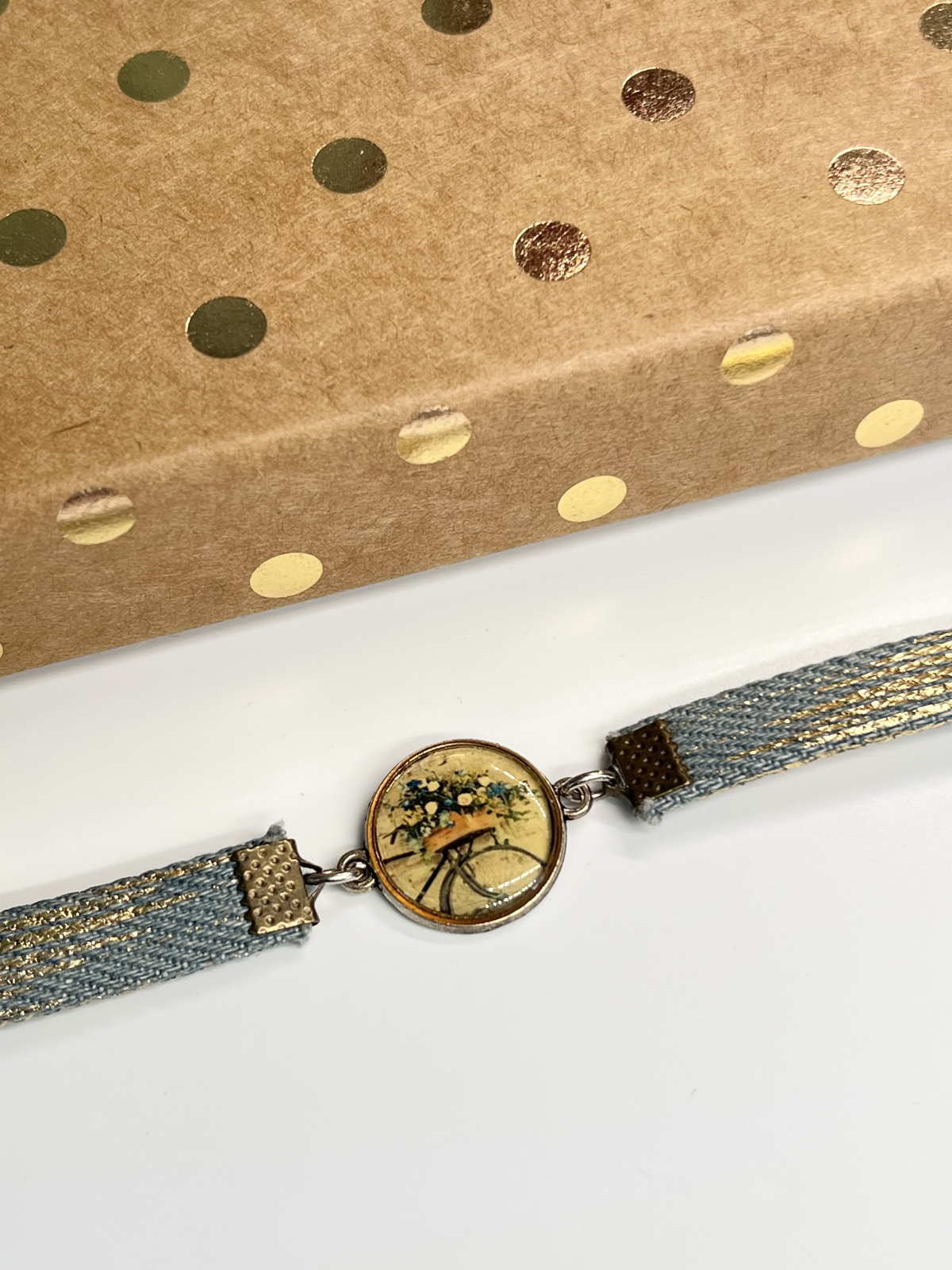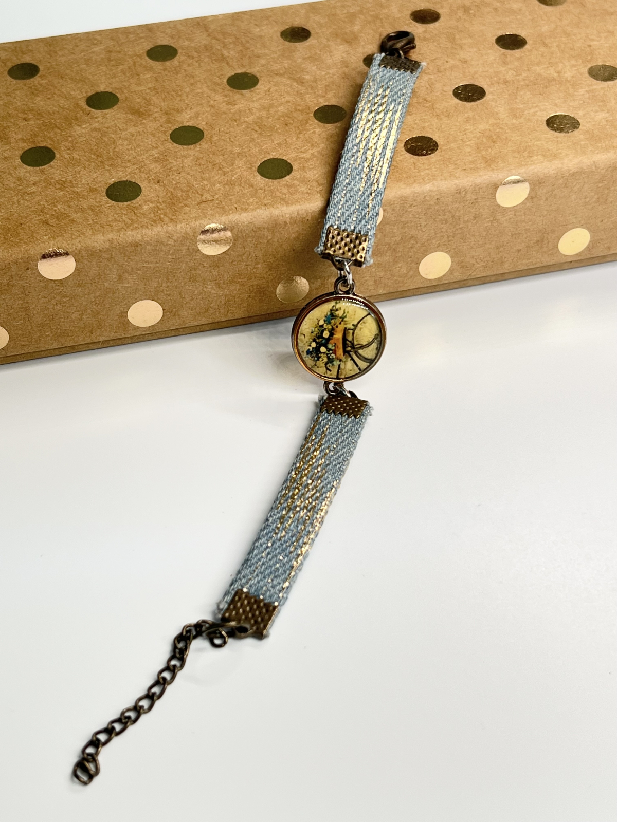 Brățări artizanale realizate din material textil cu motive colorate, inspirate din tradițiile populare. În centrul fiecărei brățări se află un link metalic decorativ cu print artistic, protejat cu rășină transparentă ce oferă un efect lucios și elegant. Combinația de texturi și culori aduce un aer autentic, vesel și plin de personalitate, făcând fiecare brățară unică — un simbol al creativității și al bucuriei de a purta artă la încheietură.