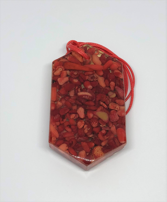 Colierul „Scutul Vitalității” este o bijuterie statement, realizată manual din rășină epoxidică transparentă, cu inserții vibrante de coral roșu natural. Forma sa geometrică, asemănătoare unui scut stilizat, simbolizează protecția, curajul și forța interioară.