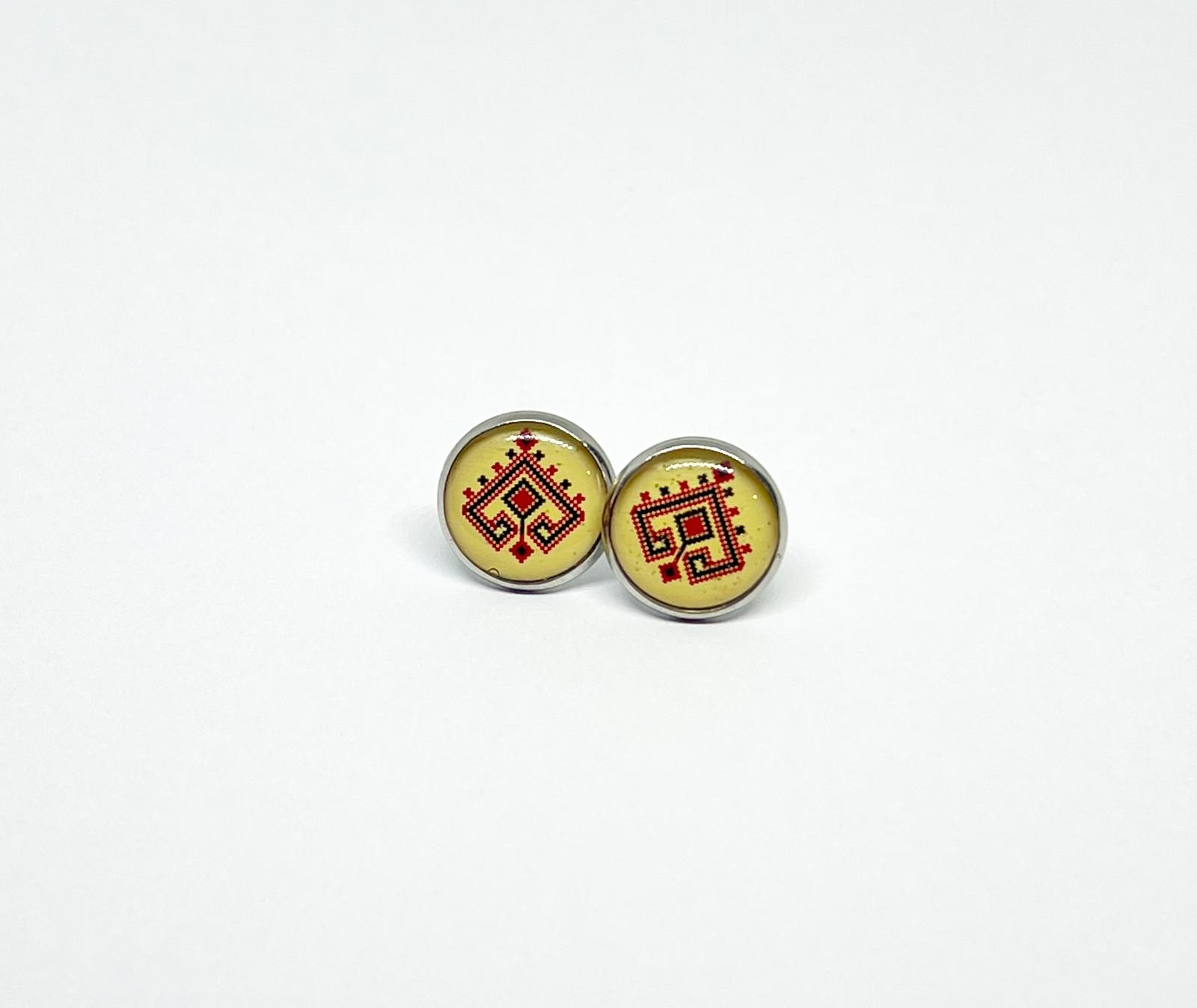 Cercei cu motiv geometric tradițional în roșu și negru, inspirat din motivele cusute pe ii vechi. Realizați manual din rășină pe bază din oțel inoxidabil, acești cercei păstrează esența tradiției într-o formă modernă.