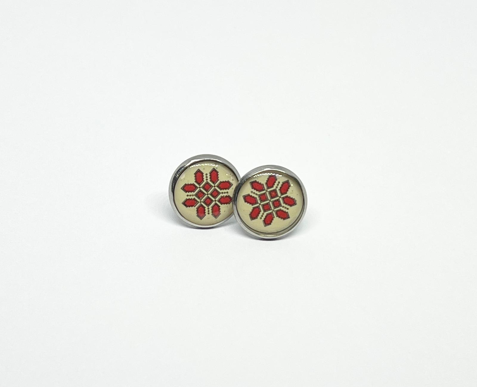 Cercei rotunzi cu model tradițional în formă de stea roșie, pe fundal crem, protejați cu rășină lucioasă. Un simbol al dorului și al tradiției românești, reinterpretat în formă modernă și minimalistă.
