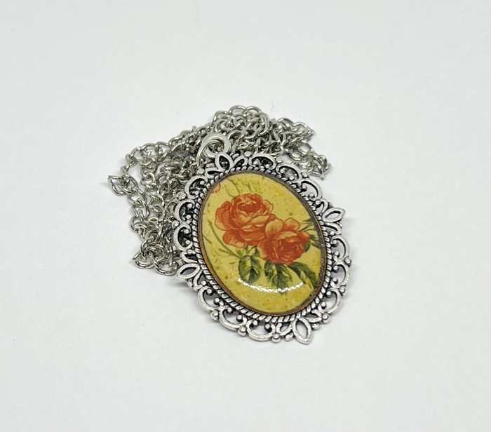 Colier handmade cu pandantiv oval, decorat cu trandafiri în nuanțe de portocaliu și roșu, așezați pe un fundal galben cald. Printul este acoperit manual cu rășină epoxidică, pentru strălucire și durabilitate. Rama filigranată oferă un aspect clasic și elegant.