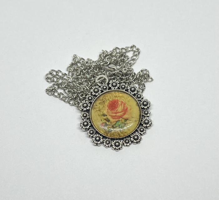 Colier cu pandantiv rotund decorat cu un trandafir roz pe fundal bej cald, un model plin de romantism și rafinament. Rășina aplicată manual oferă o strălucire delicată și protejează printul de uzură. Marginea decorată cu flori metalice conferă pandantivului un farmec retro și feminin.