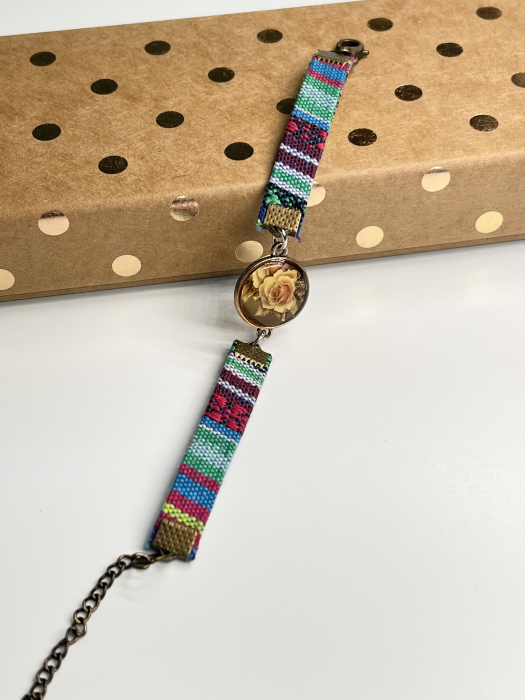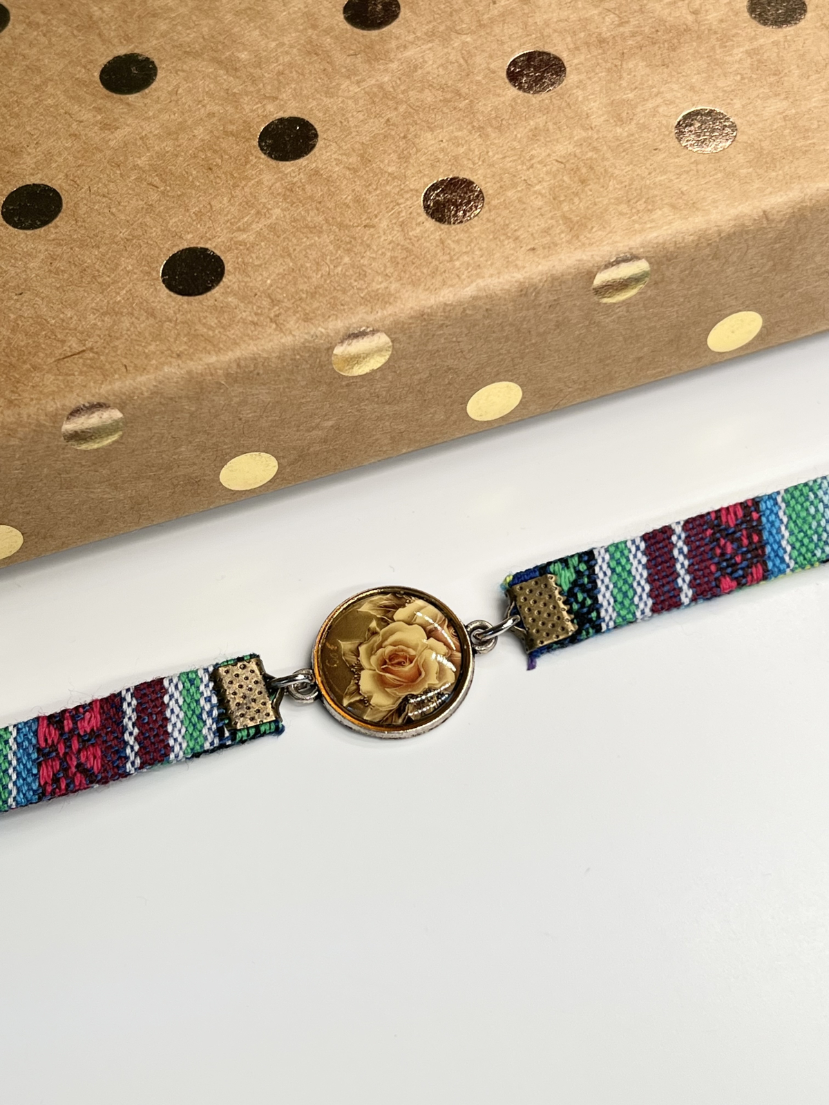 Brățări artizanale realizate din material textil cu motive colorate, inspirate din tradițiile populare. În centrul fiecărei brățări se află un link metalic decorativ cu print artistic, protejat cu rășină transparentă ce oferă un efect lucios și elegant. Combinația de texturi și culori aduce un aer autentic, vesel și plin de personalitate, făcând fiecare brățară unică — un simbol al creativității și al bucuriei de a purta artă la încheietură.