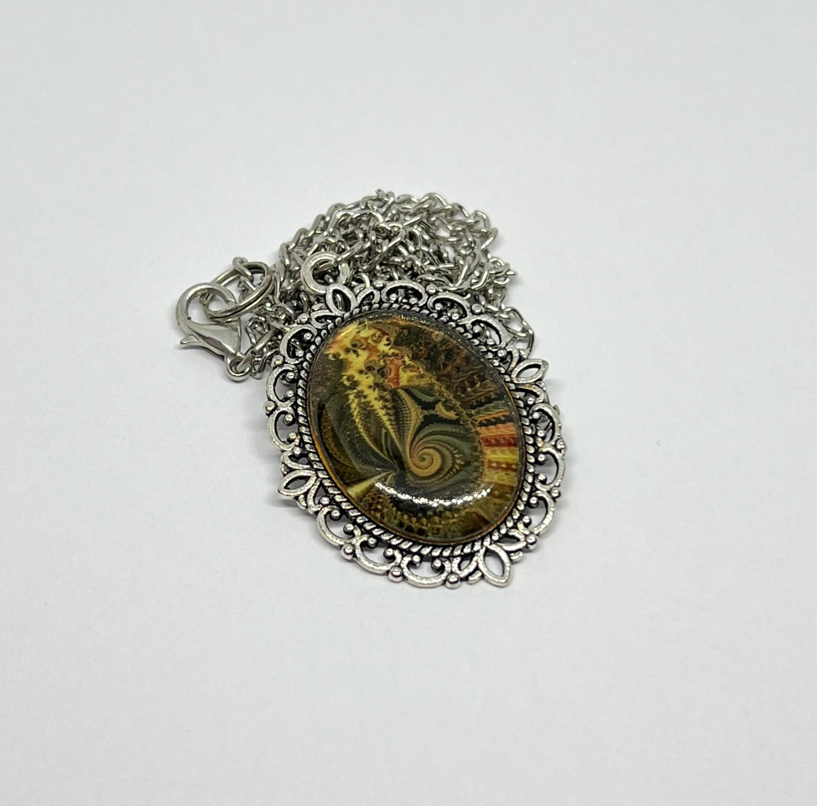 Colier cu pandantiv oval, decorat cu o spirală abstractă în nuanțe de galben, maro și portocaliu. Rășina lucioasă scoate în evidență detaliile și oferă un efect tridimensional. Un accesoriu artistic, cu aer boem și misterios.