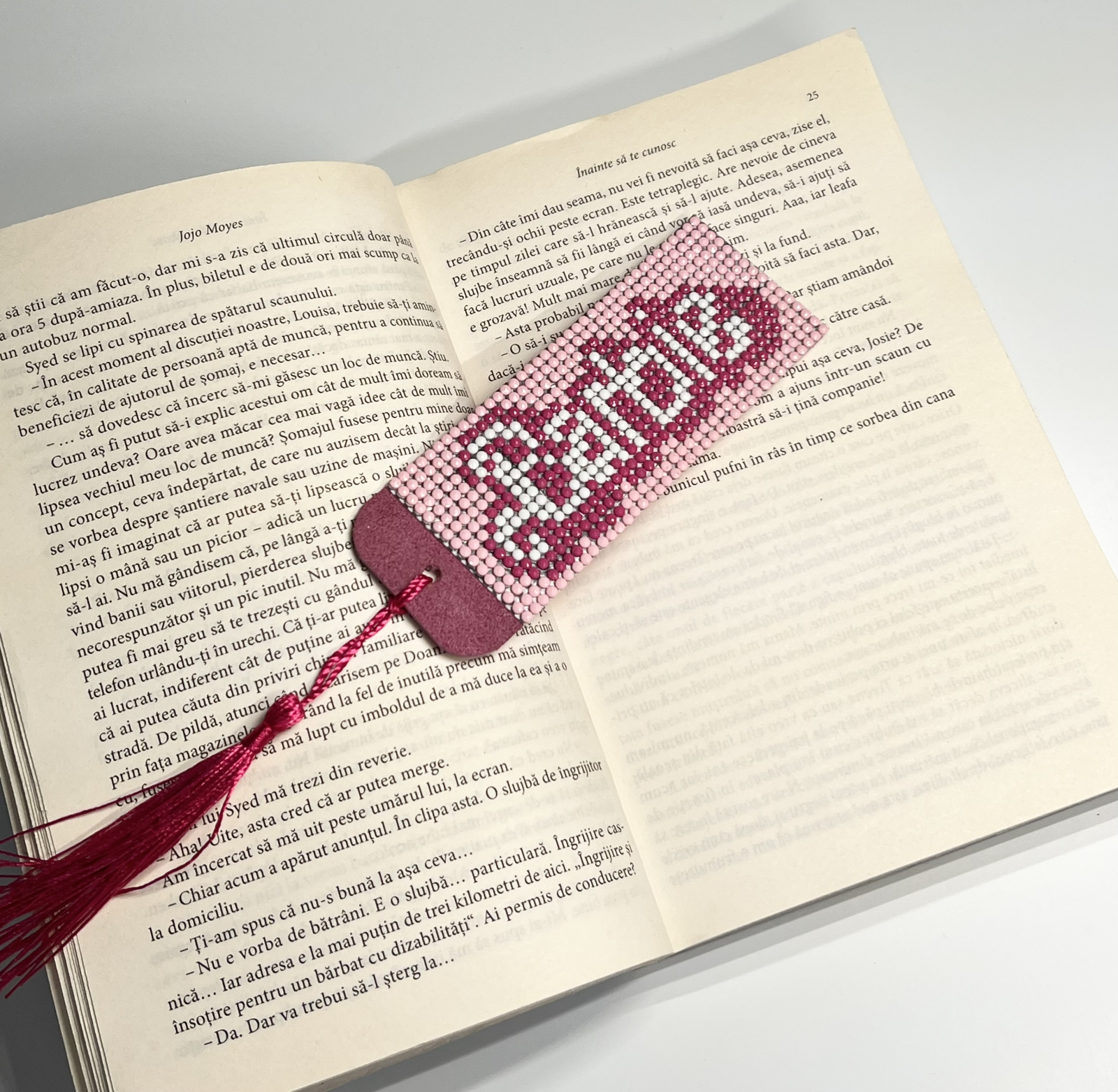 Semn de carte lucrat manual din mărgele roz, cu textul „Barbie” scris elegant pe fundal deschis. Ideal pentru iubitoarele de culoare și feminitate, aduce un strop de glam în fiecare pagină. Baza din piele naturală oferă stabilitate, iar ciucurele roz completează designul jucăuș.