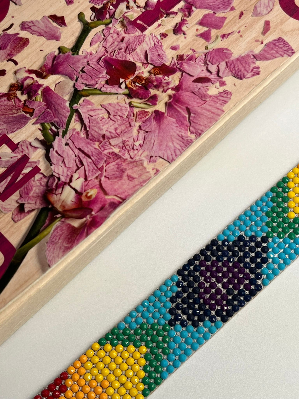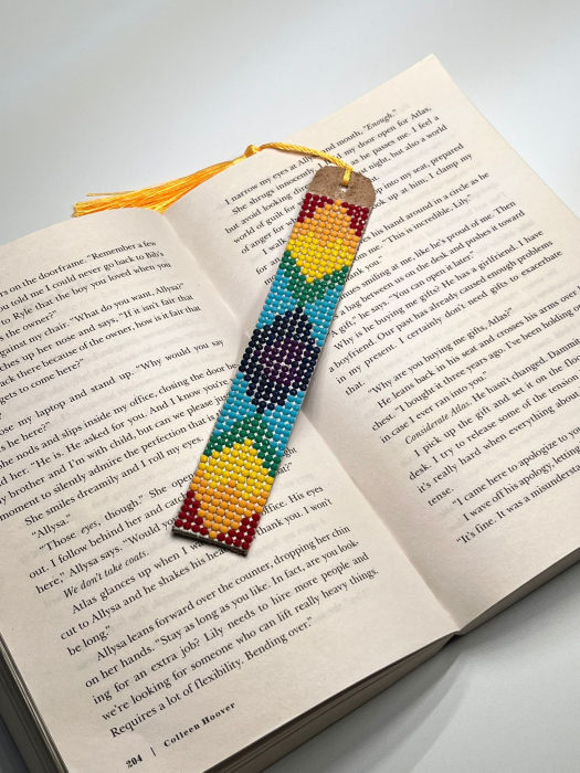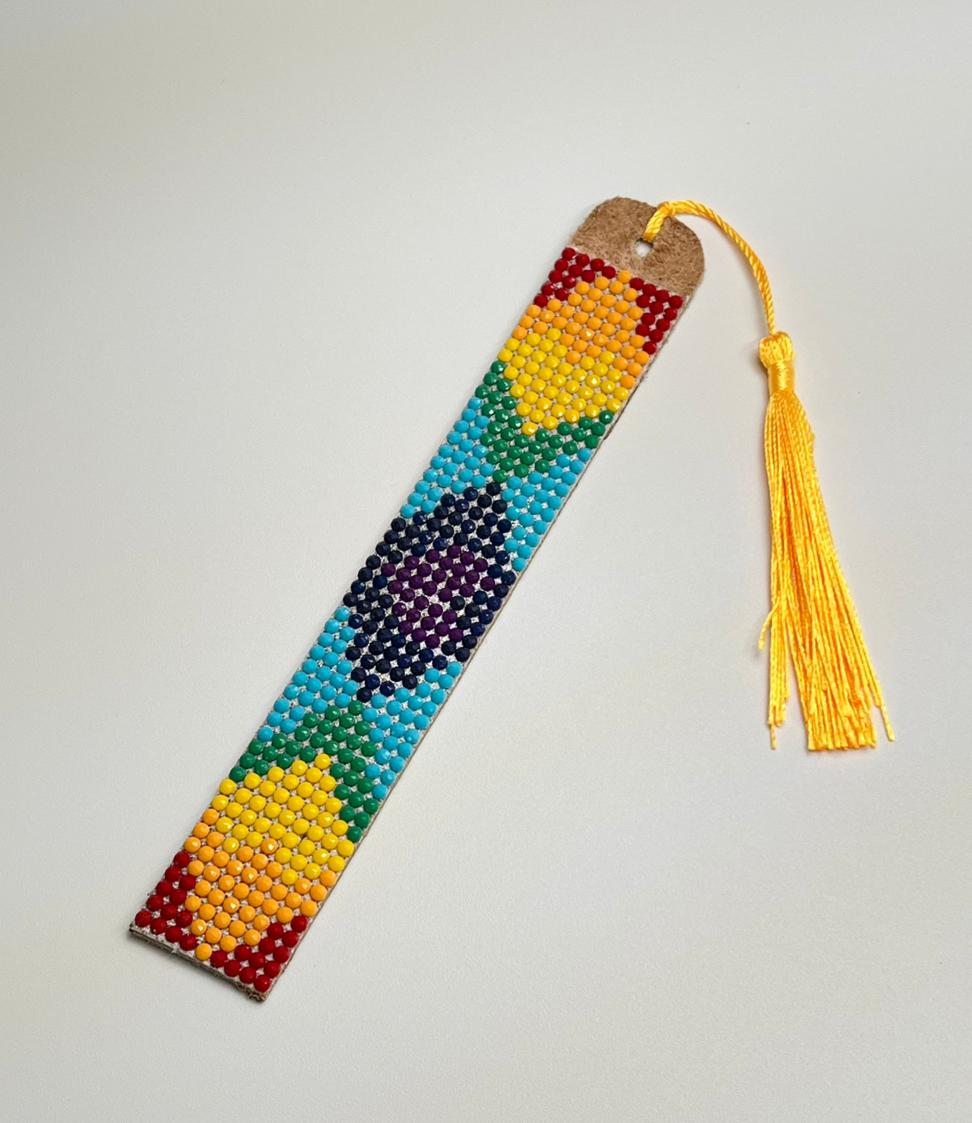 Un model viu colorat, cu flori stilizate în nuanțe de galben, portocaliu, roșu, verde, albastru și mov, ce aduc un strop de veselie oricărei cărți. Baza din piele naturală și ciucurele galben solar fac din acest semn de carte un accesoriu optimist și energic.
