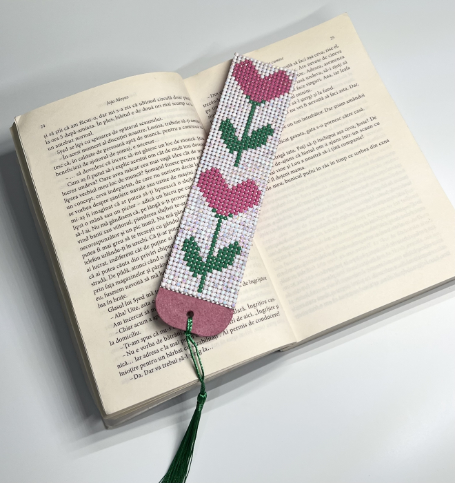 Semn de carte handmade, decorat cu inimi în formă de flori pe fundal alb. Un model delicat, plin de optimism, care aduce aminte de primăvară și de bucuria lucrurilor simple. Baza din piele naturală îi conferă un aspect elegant și o rezistență sporită.