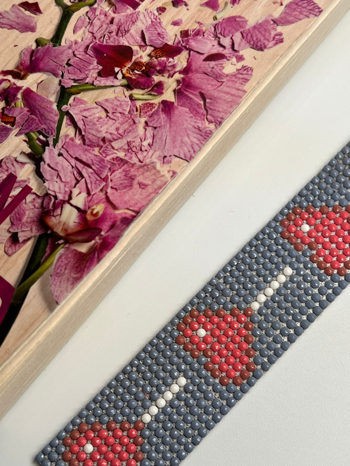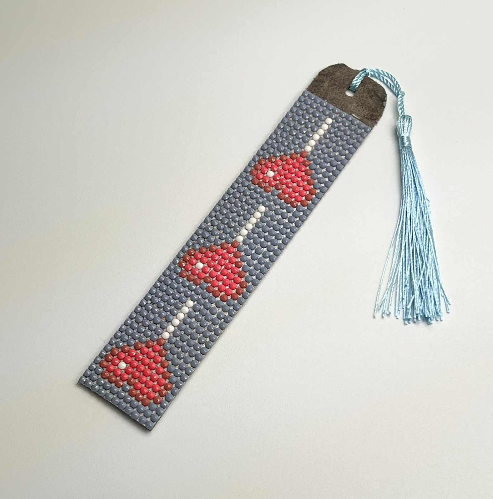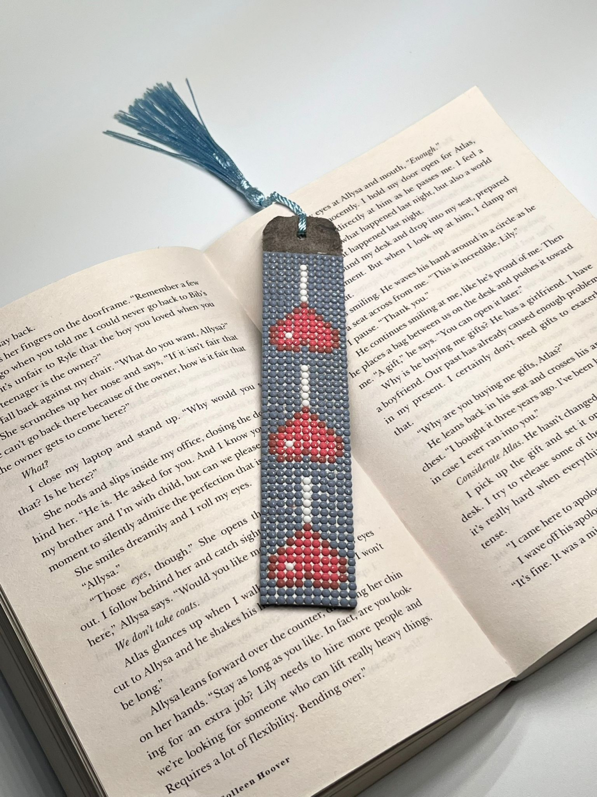 Cu un design simplu și romantic, acest semn de carte prezintă o serie de inimi roșii aliniate pe un fundal gri, totul lucrat cu grijă pe piele naturală. Ciucurele bleu oferă un contrast delicat. Ideal pentru un cadou cu mesaj simbolic sau pentru lecturi de suflet.