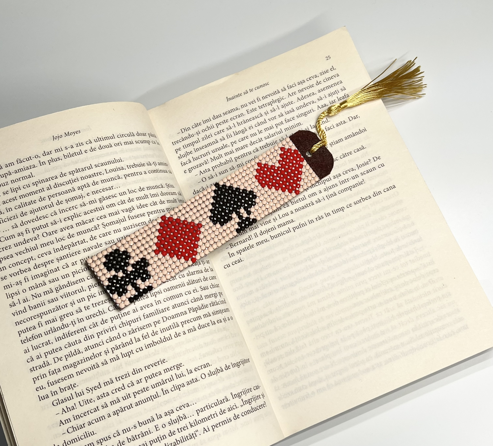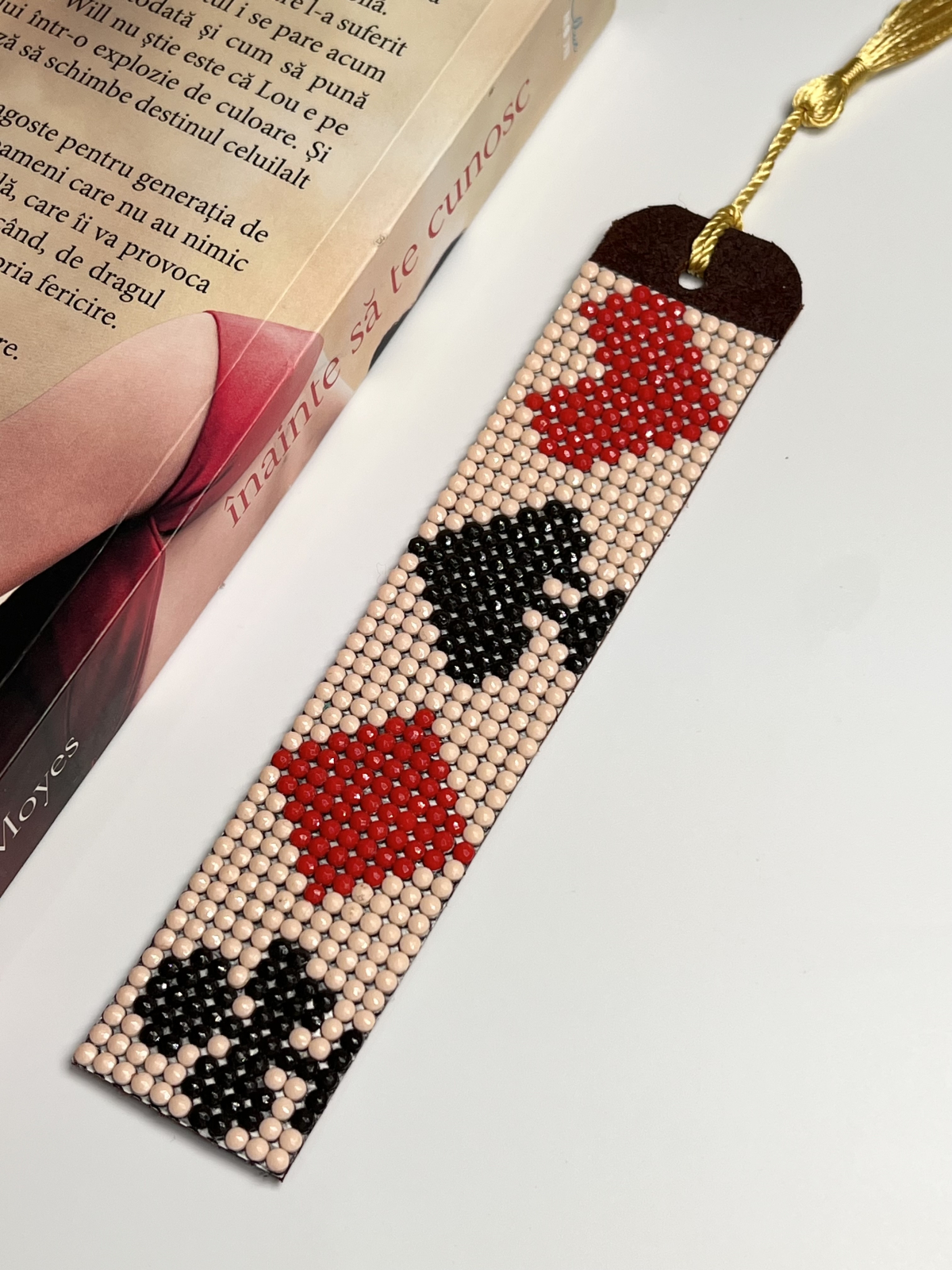 Semn de carte handmade inspirat de cărțile de joc — romburi, inimi, trefle și pici în culori clasice. Un model elegant și original, potrivit pentru cititorii cu spirit ludic. Baza din piele naturală și ciucurele auriu îi dau un aer rafinat și atemporal.