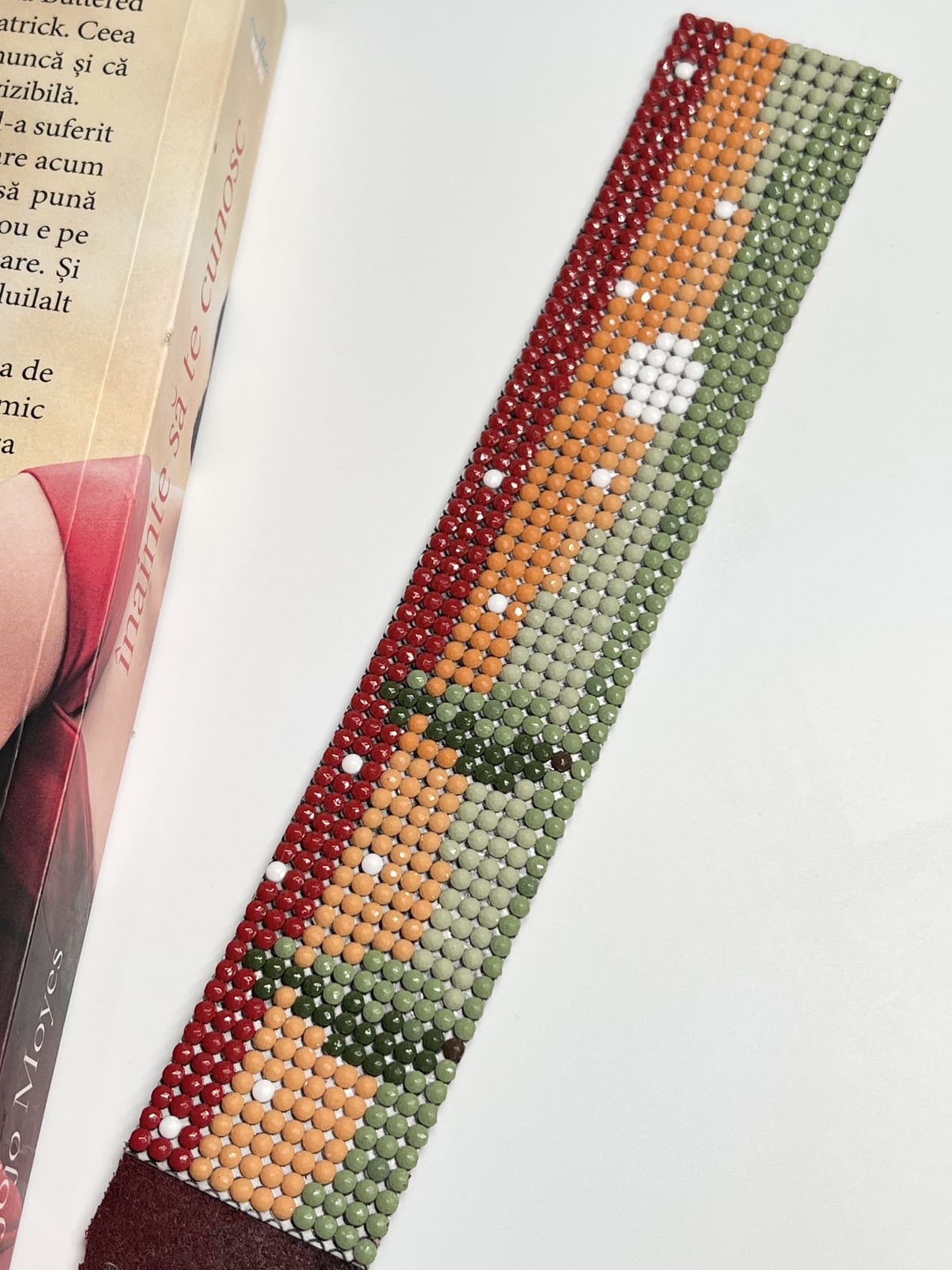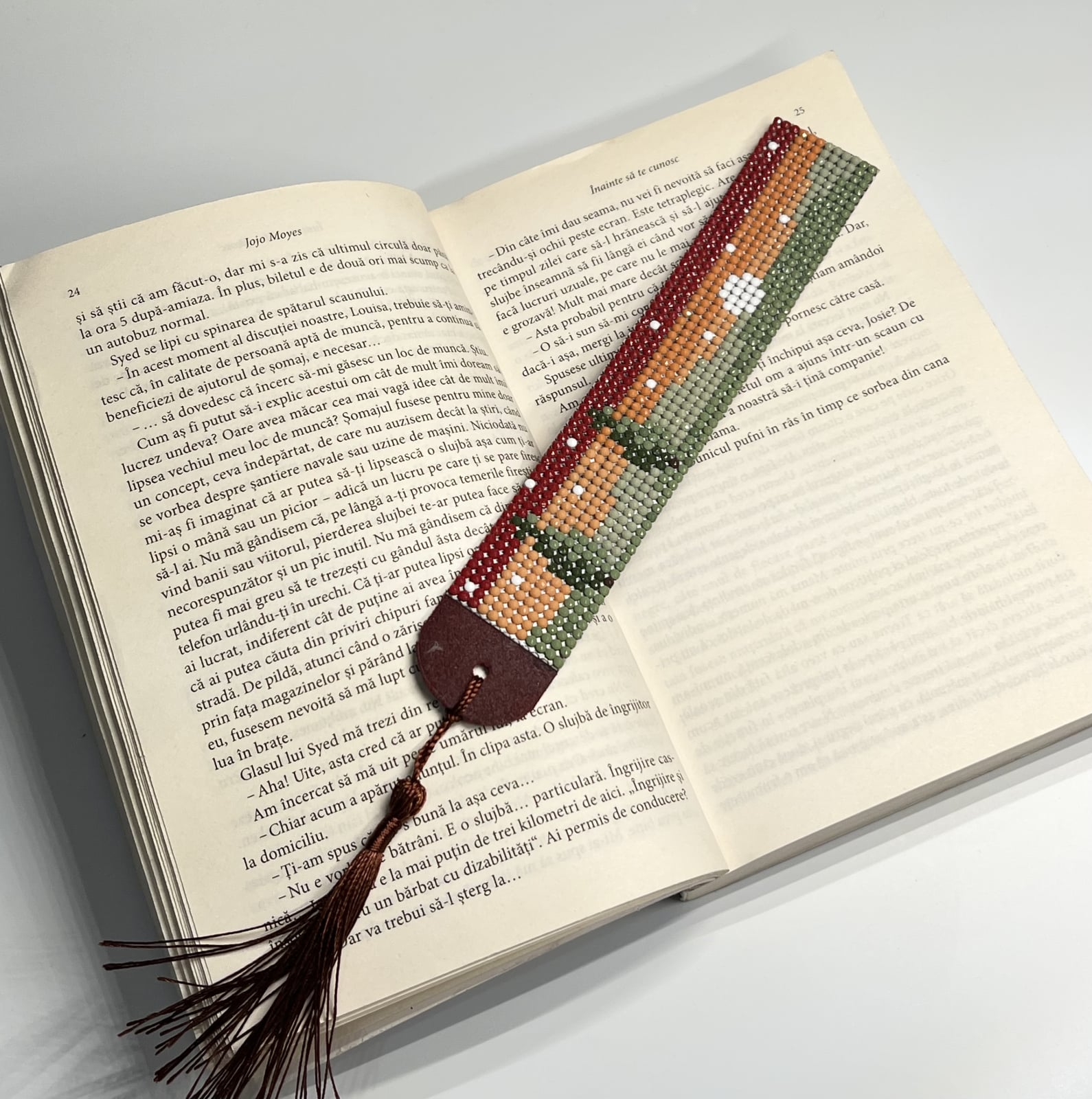 Semn de carte handmade cu nuanțe calde de portocaliu, verde și maro, inspirat de frunzele de toamnă. Un detaliu elegant pentru iubitorii de cărți, natură și seri cozy cu o ceașcă de ceai. Baza din piele naturală îi oferă stabilitate și un aspect premium.