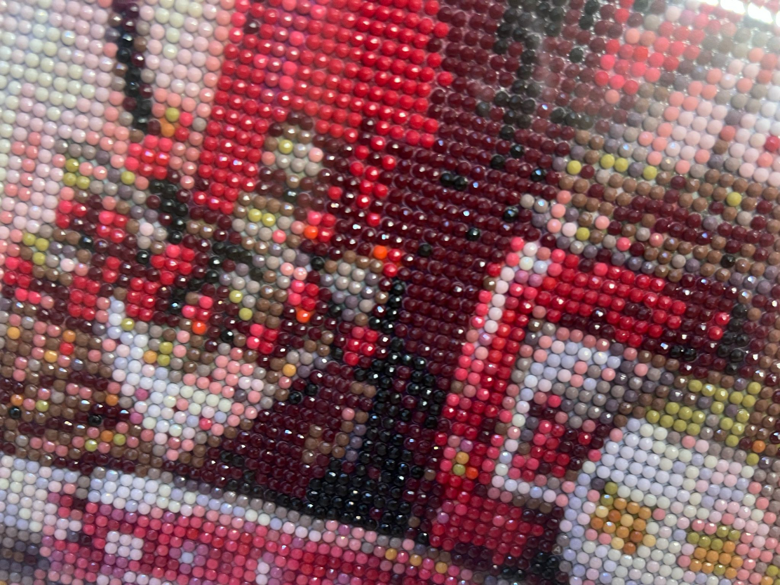 Lucrat manual din pietricele acrilice strălucitoare, acest tablou combină frumusețea artei handmade cu nostalgia caselor tradiționale. Rama din lemn și passepartout-ul roșu completează perfect paleta caldă a compoziției.