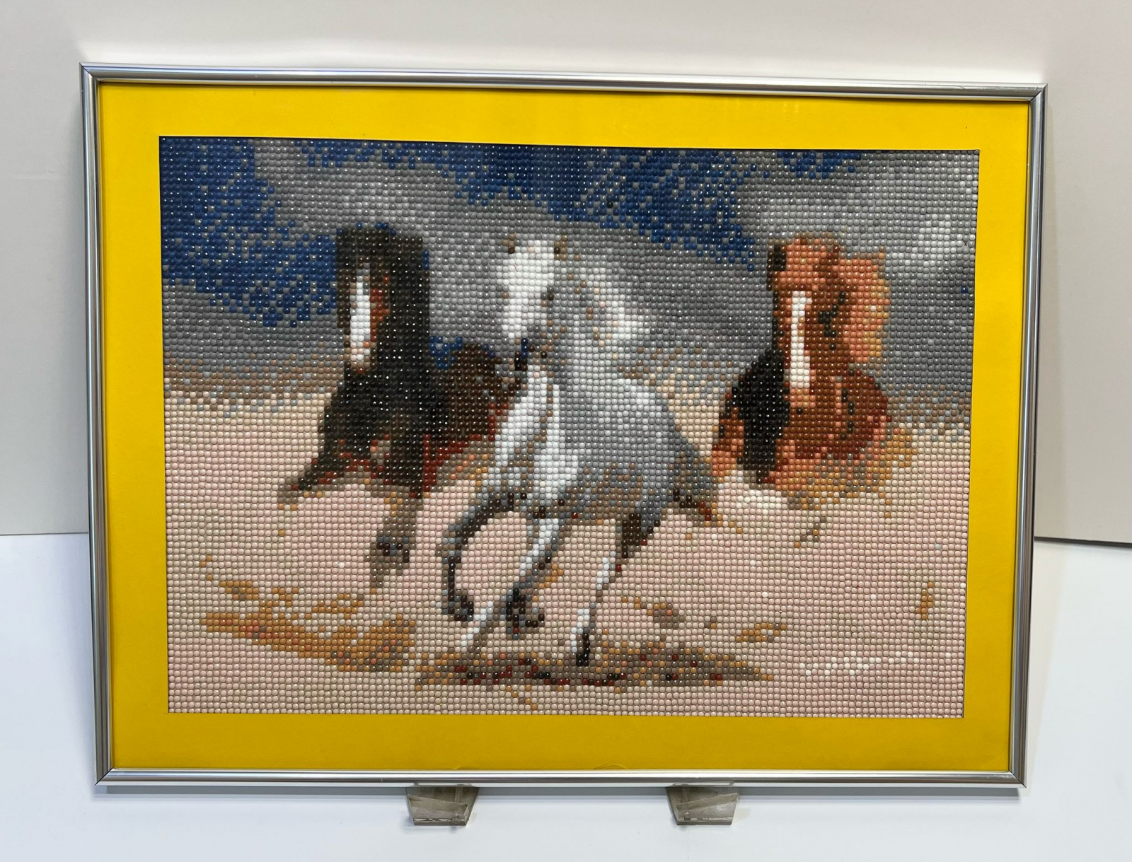 Adaugă un strop de energie și dinamism în casa ta cu acest impresionant tablou Diamond Painting, ce ilustrează trei cai în galop, simbol al forței, libertății și eleganței. Realizat cu migală din mii de pietricele strălucitoare, acest tablou aduce o notă aparte oricărui interior. Rama elegantă și passepartout-ul galben intens completează perfect imaginea, punând-o în valoare.