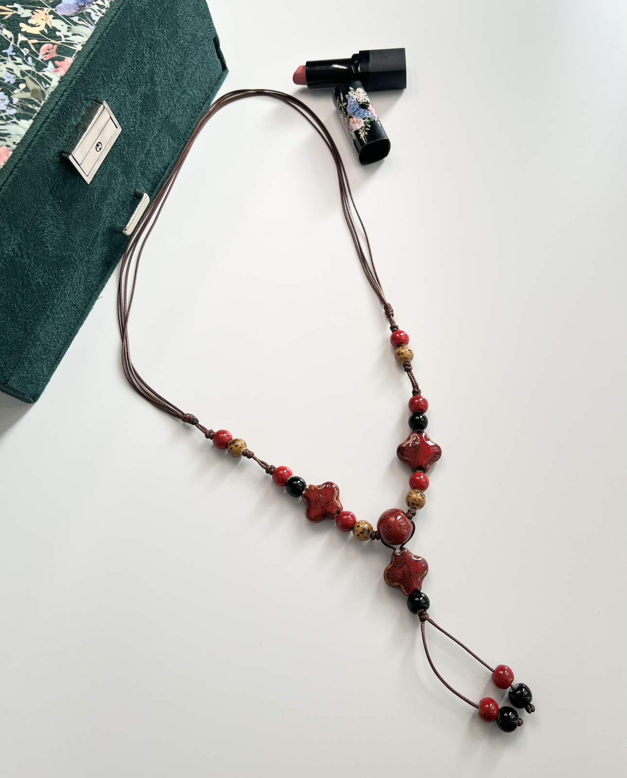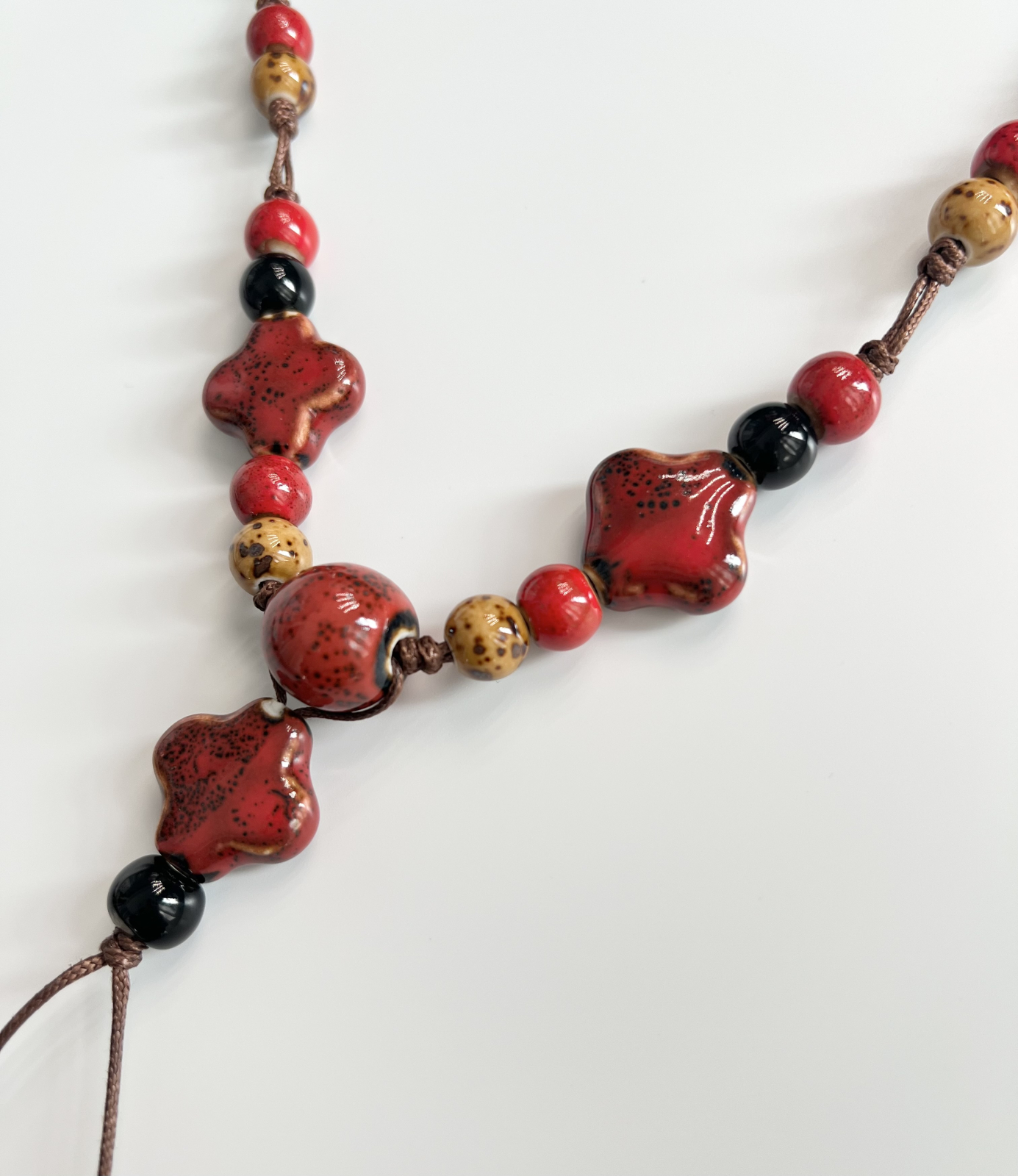 Un colier de efect, cu mărgele ceramice în formă de floare și sferice, în nuanțe aprinse de roșu, negru și maro (10–16 mm), completate cu bile mici decorative (6–8 mm).