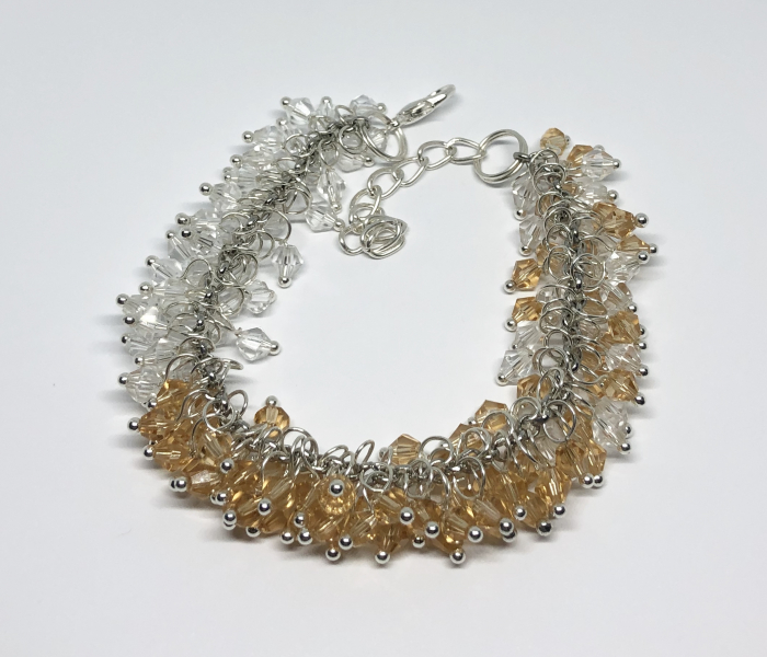 Aceste brățări sunt realizate manual din lanț metalic rezistent și cristale biconice din sticlă, creând un efect spectaculos de volum și strălucire. Designul împletit al inelelor metalice permite cristalelor să se miște liber, producând un sunet discret și plăcut la purtare – transformându-le în adevărate brățări zdrăngănici.